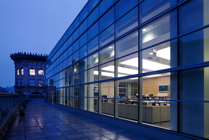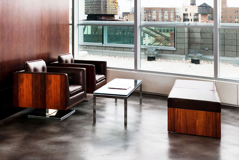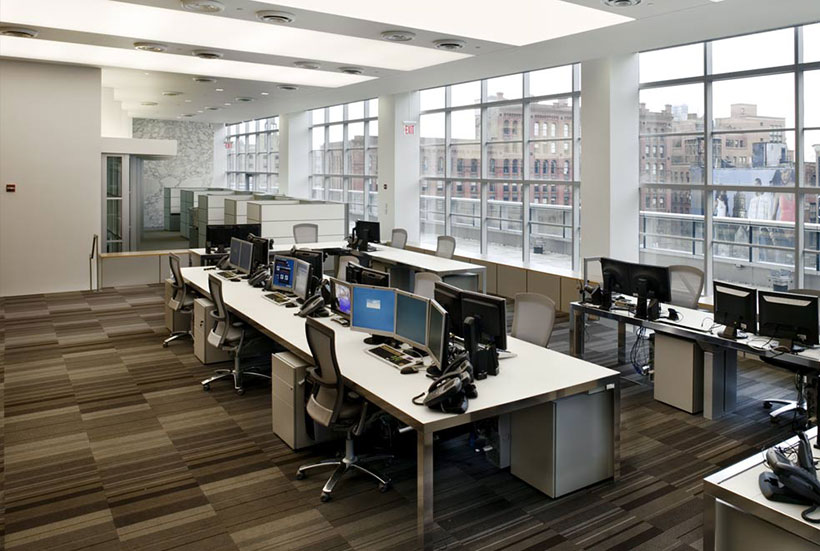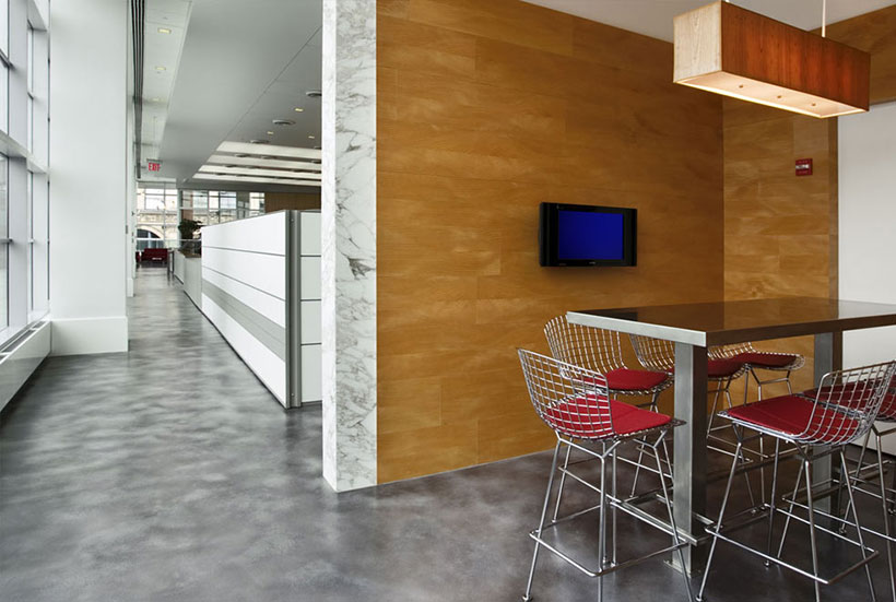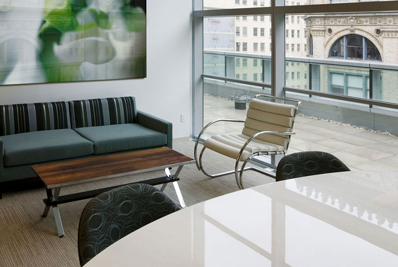 會議室里的人字形地毯條紋地毯在交易大廳是傳統(tǒng)的男裝衣料的當(dāng)代借鑒。有木鑲板在辦公室,但在歐洲輕型核桃,用干凈的細(xì)節(jié)。